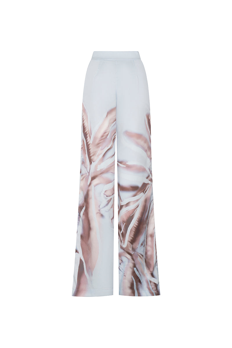 High-waisted trousers with a wide-leg silhouette, designed to elongate the figure with effortless fluidity. A concealed side-zip closure ensures a sleek fit at the waist, while the relaxed leg moves gracefully with every step.