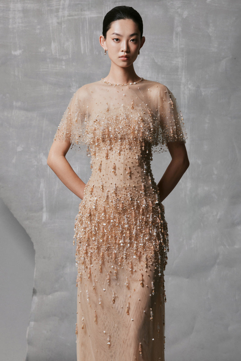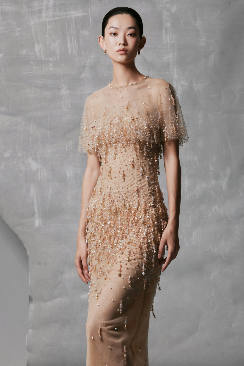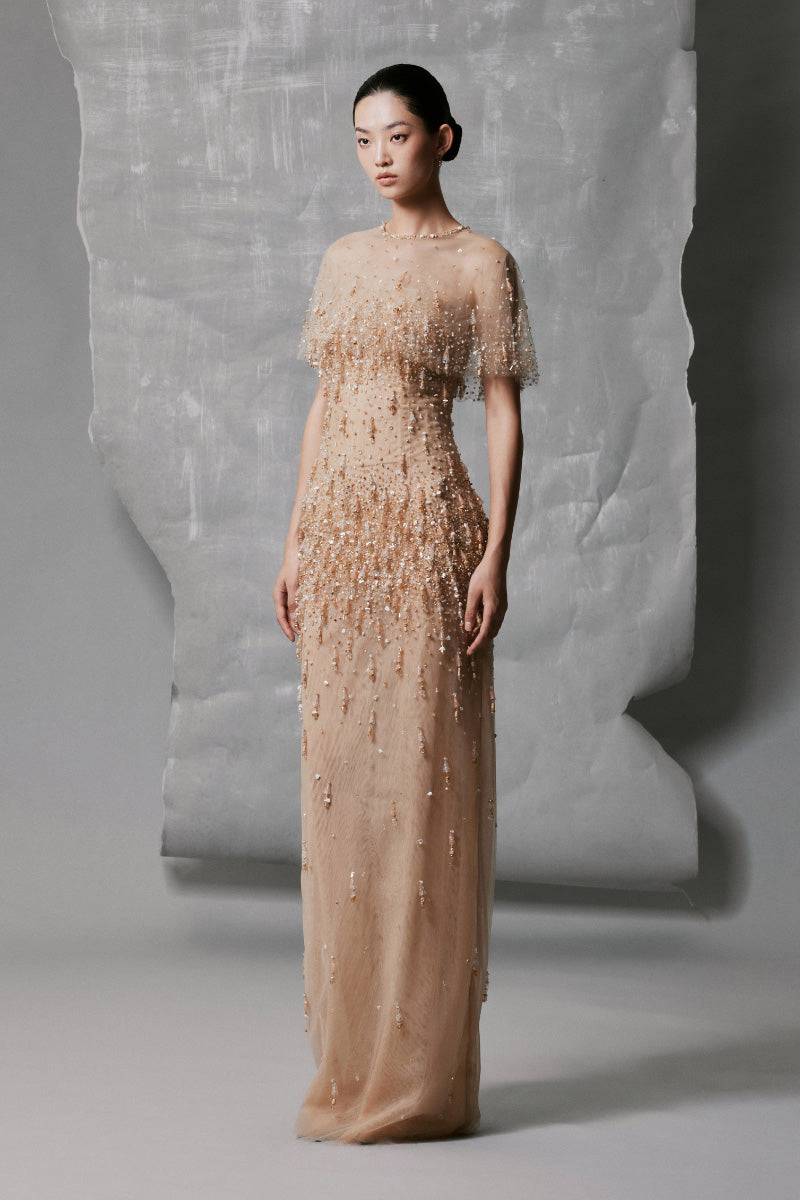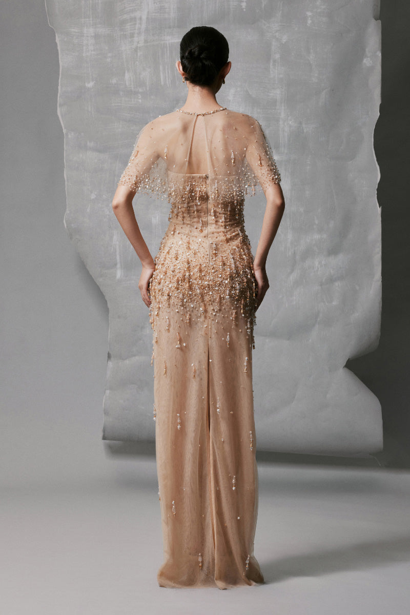 Nude-toned gown crafted from delicate mesh, intricately hand-embellished with crystal teardrops that cascade from the bodice to the hem, creating a radiant, liquid-like shimmer. The design includes a detachable matching cape made from the same sheer mesh, adding ethereal volume and grace.