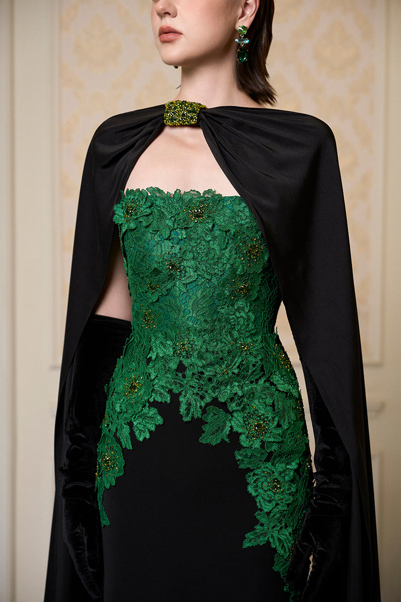 strapless column gown with long cape in dark green