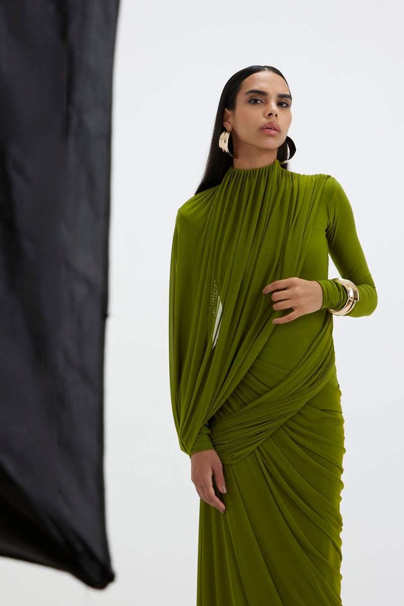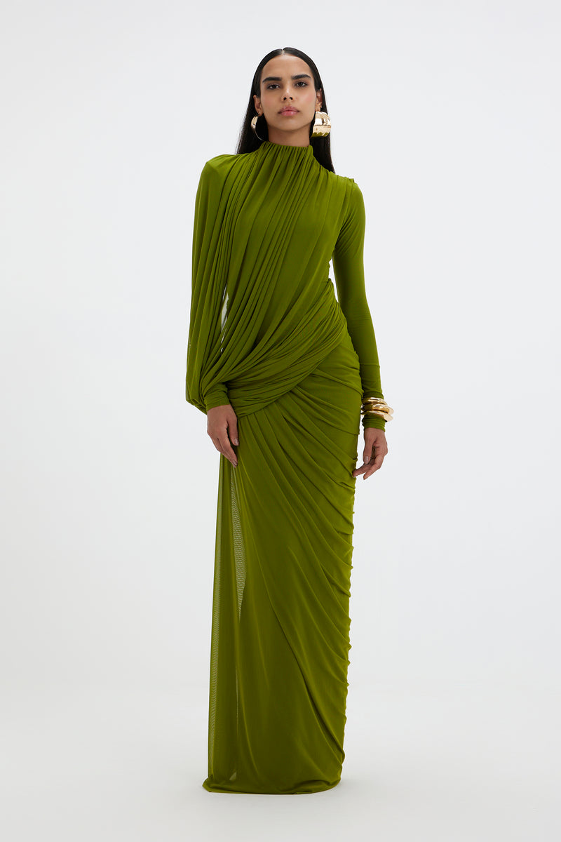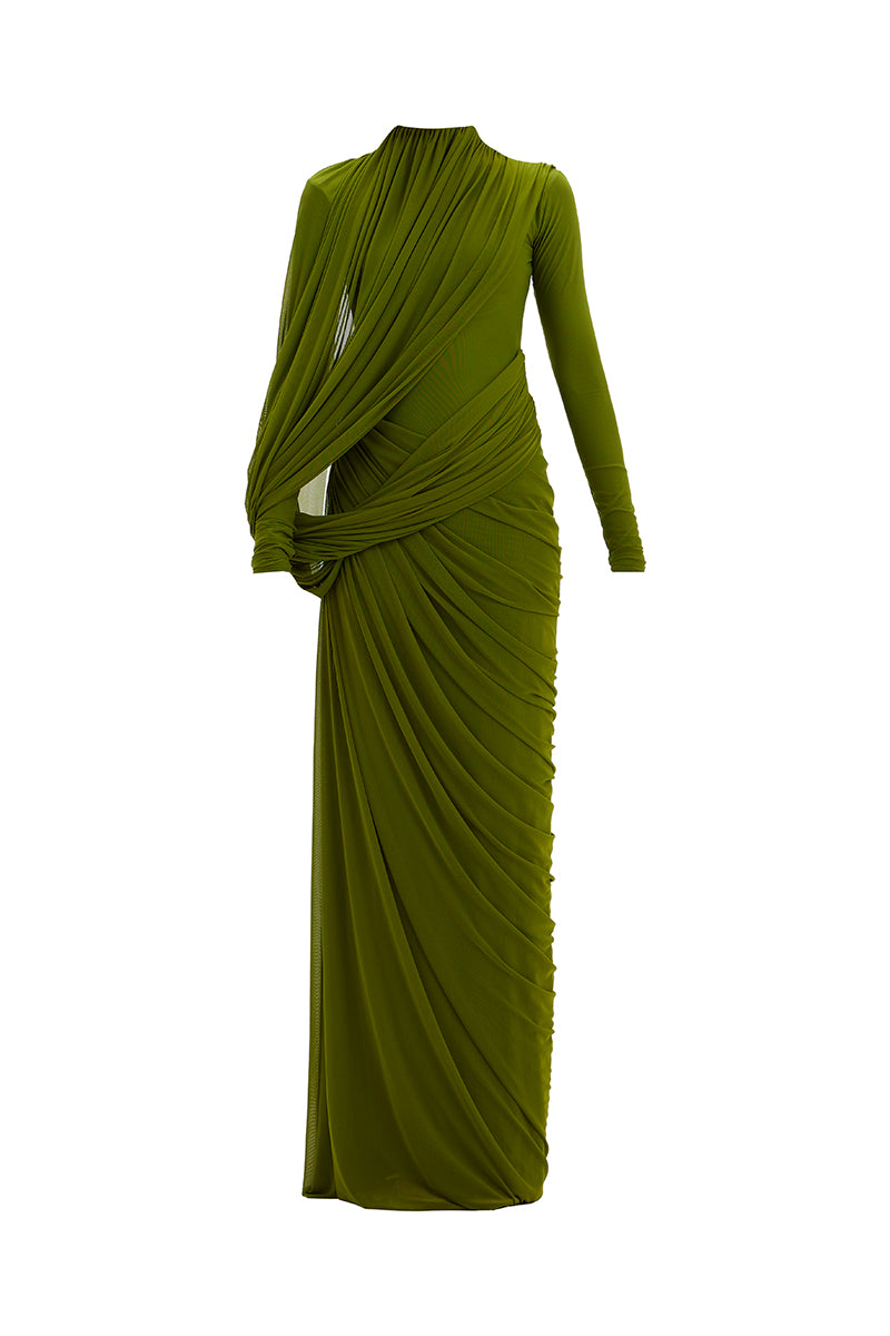 - A high-neck gown features full sleeves and an artfully draped bottom that cascades asymmetrically from one side. At the top, a pleated drape flows from the neckline, elegantly twisting around the arm and anchoring at the side to form a soft loop