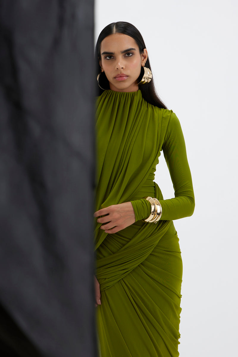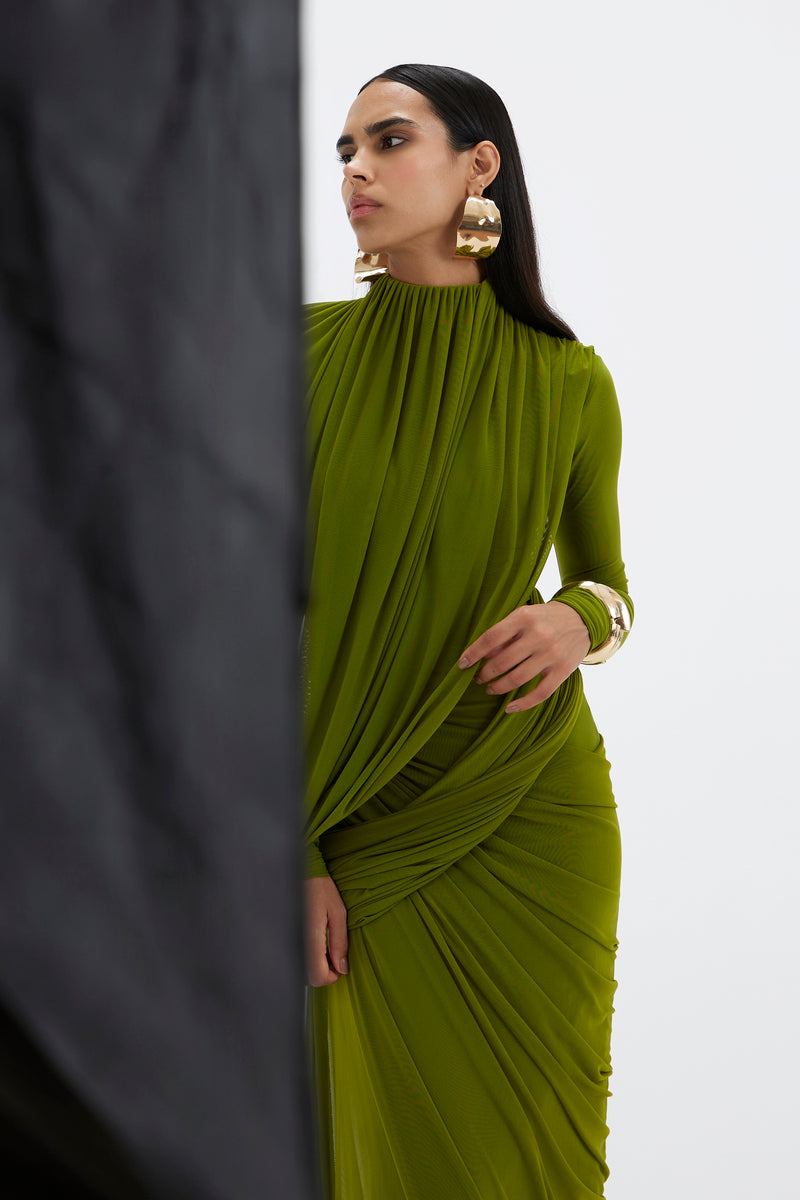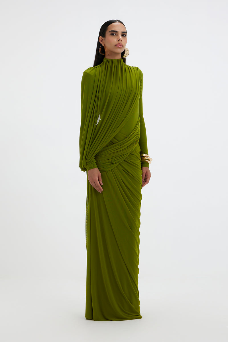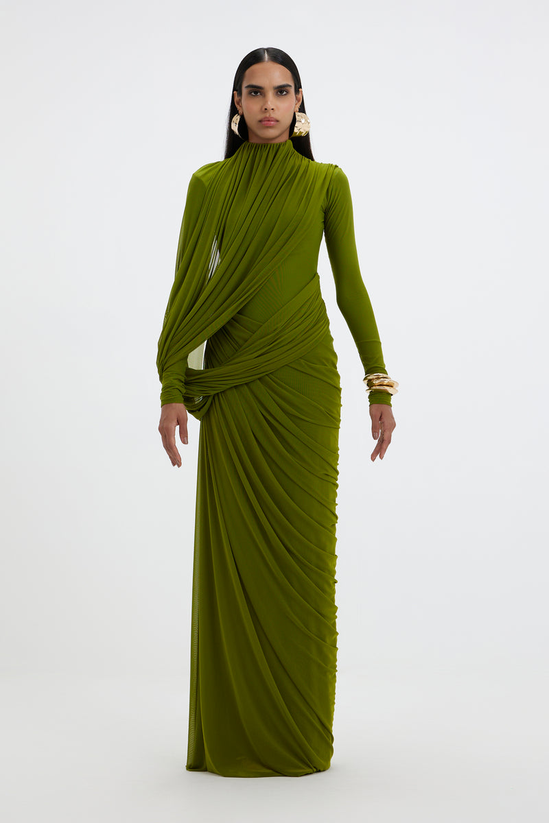 - A high-neck gown features full sleeves and an artfully draped bottom that cascades asymmetrically from one side. At the top, a pleated drape flows from the neckline, elegantly twisting around the arm and anchoring at the side to form a soft loop