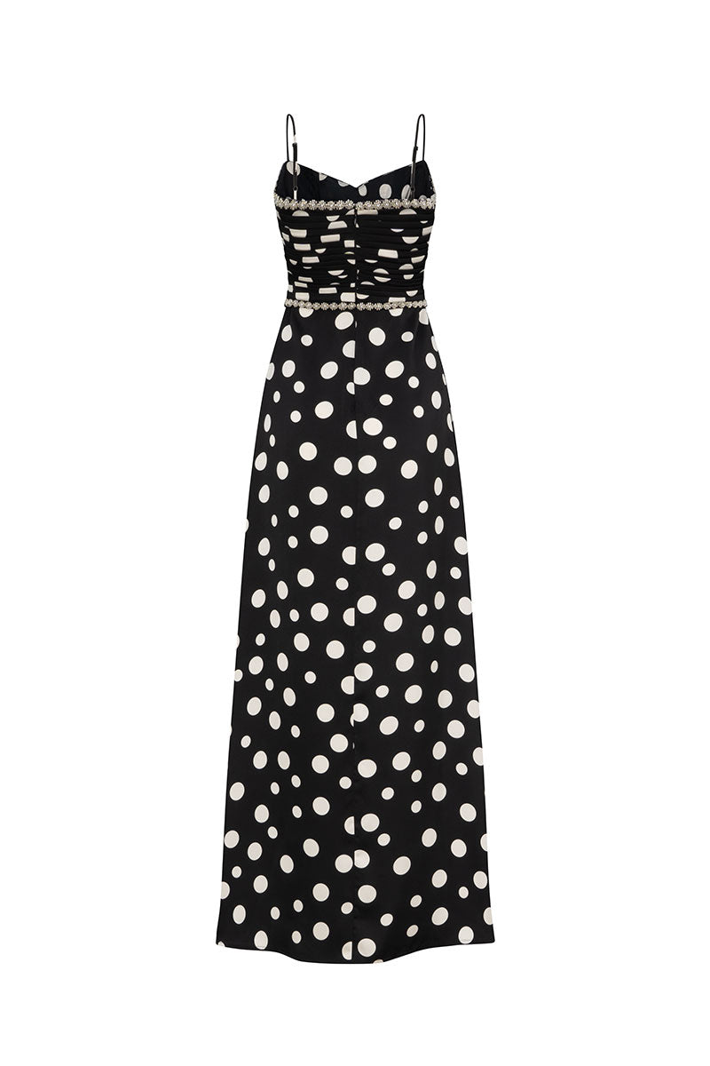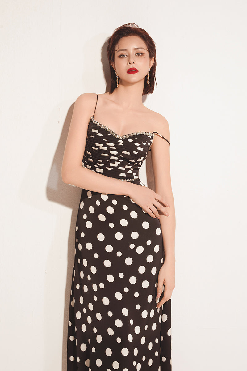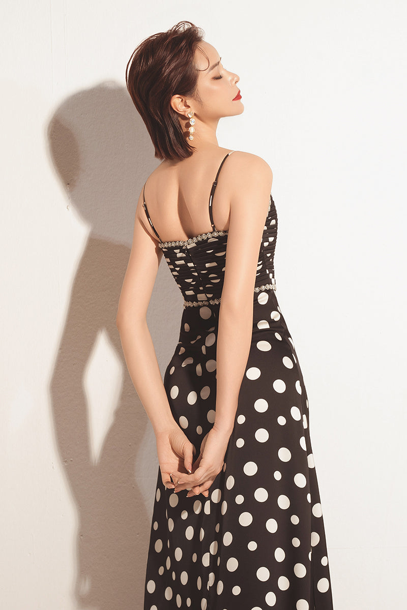 This dress features delicate spaghetti straps and a sweetheart neckline, which is beautifully trimmed with contrasting pleat detailing. A band of subtle silver or crystal embellishment defines the high waistline and neckline, adding a touch of sparkle. The dress flows into a graceful, floor-skimming silhouette, perfect for a chic evening or cocktail event.