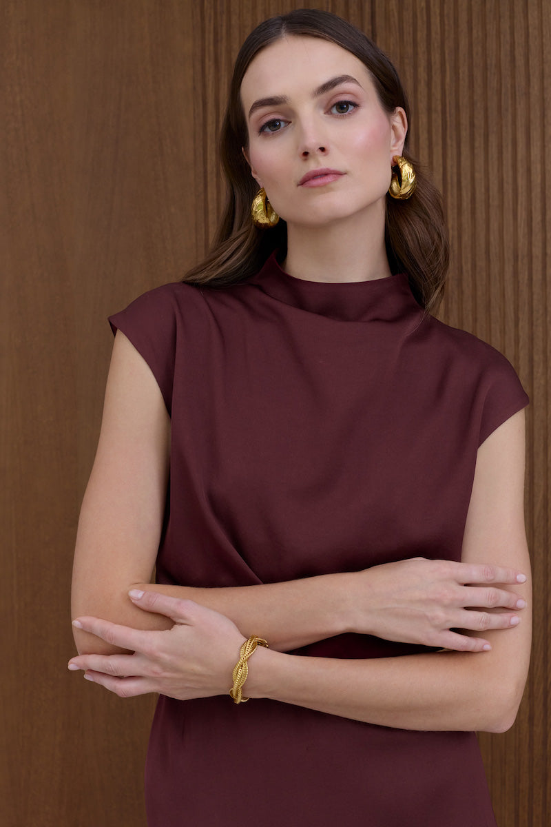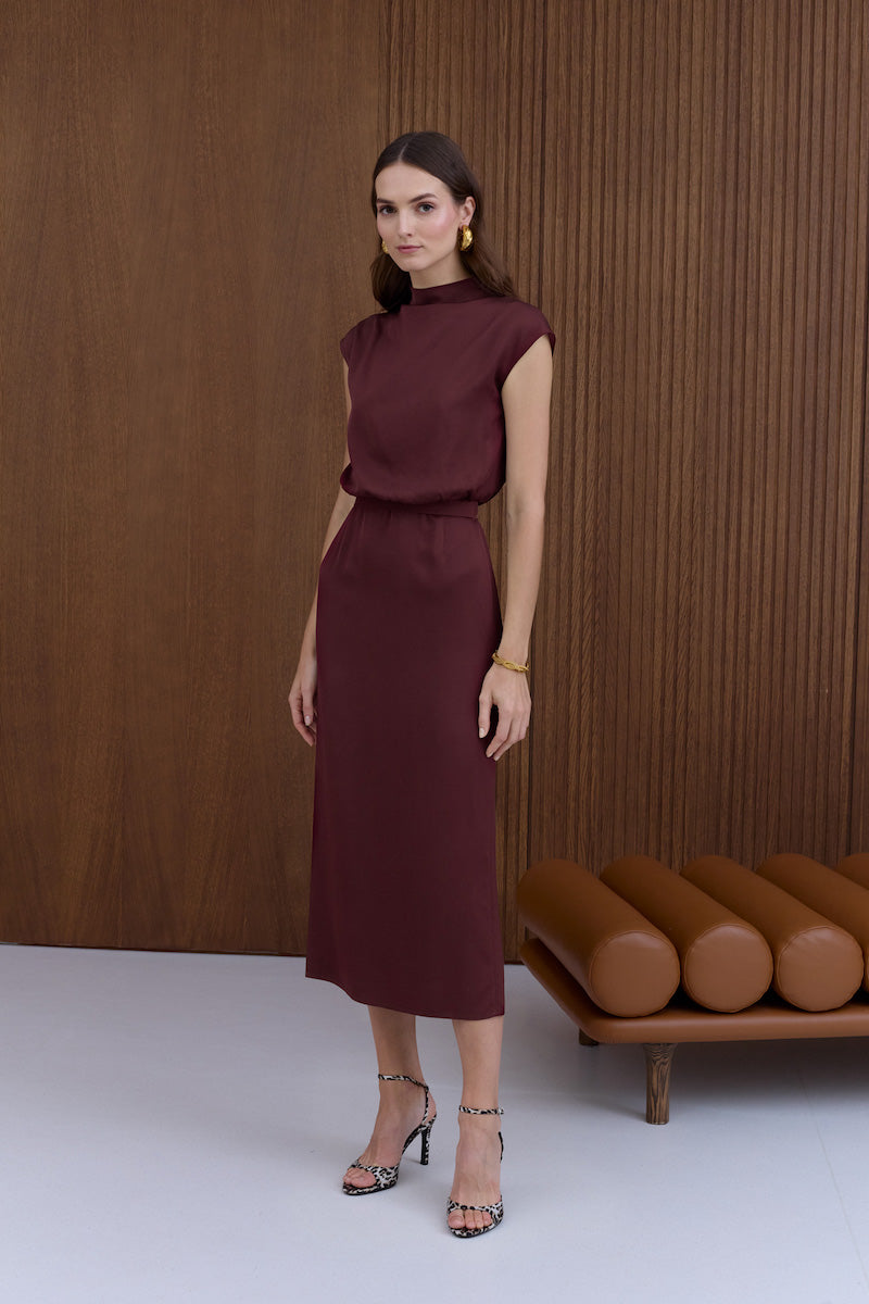 Drenched in a rich, wine-red hue, TESSA radiates with confidence and modern glamour. Its tailored waist and fluid drape are designed to flatter while allowing effortless movement, inviting compliments with every step.
