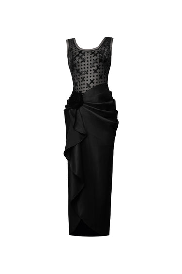 - Skirt: Draped design with velvet flower accent