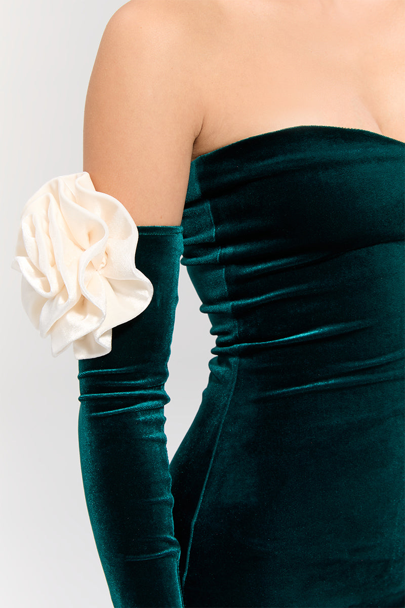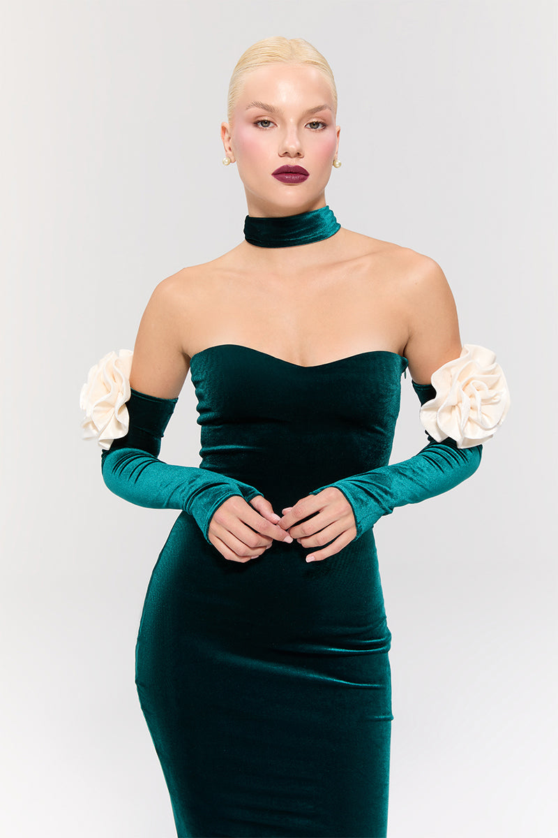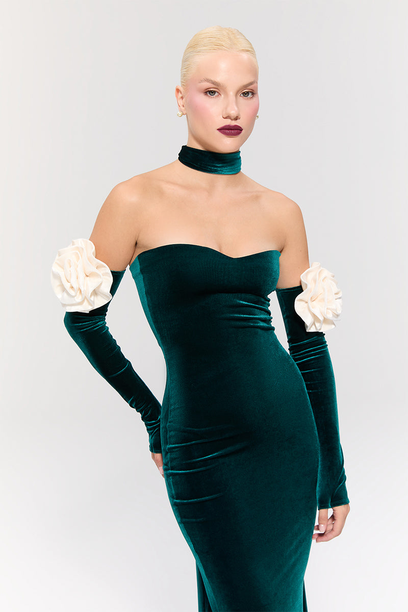 - The green velvet mermaid dress offers a sophisticated silhouette, with white rose details on the sleeves adding a romantic, elegant touch