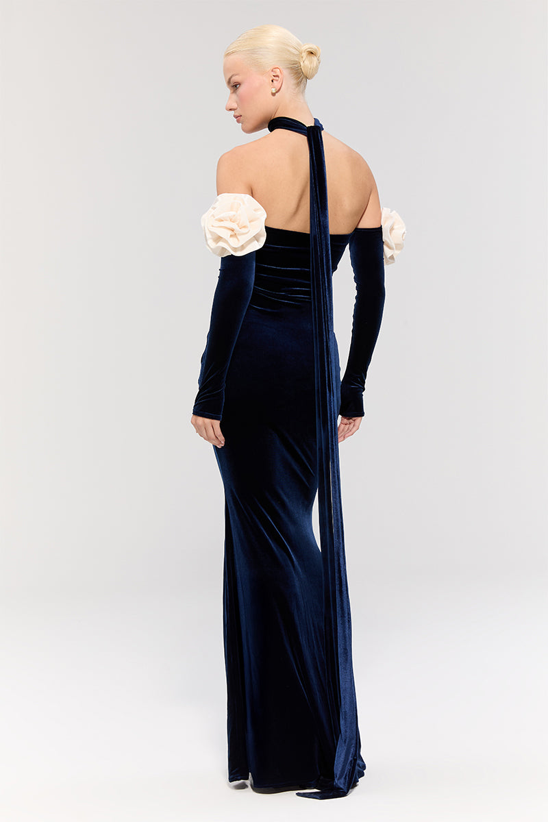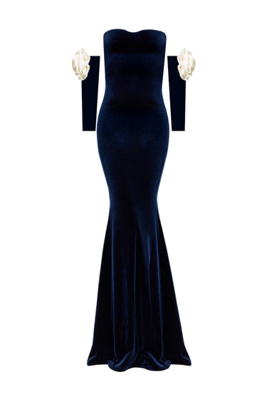 - The navy velvet mermaid dress features white rose sleeve details for a romantic, elegant look
