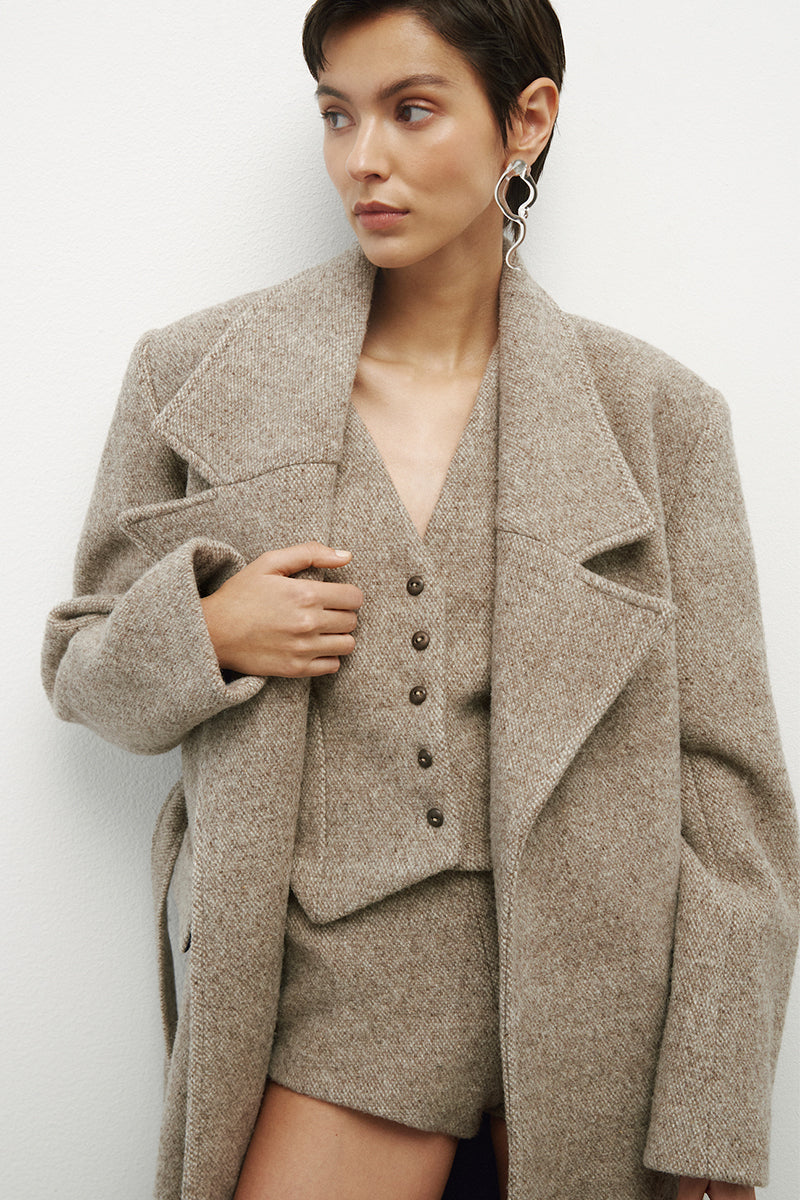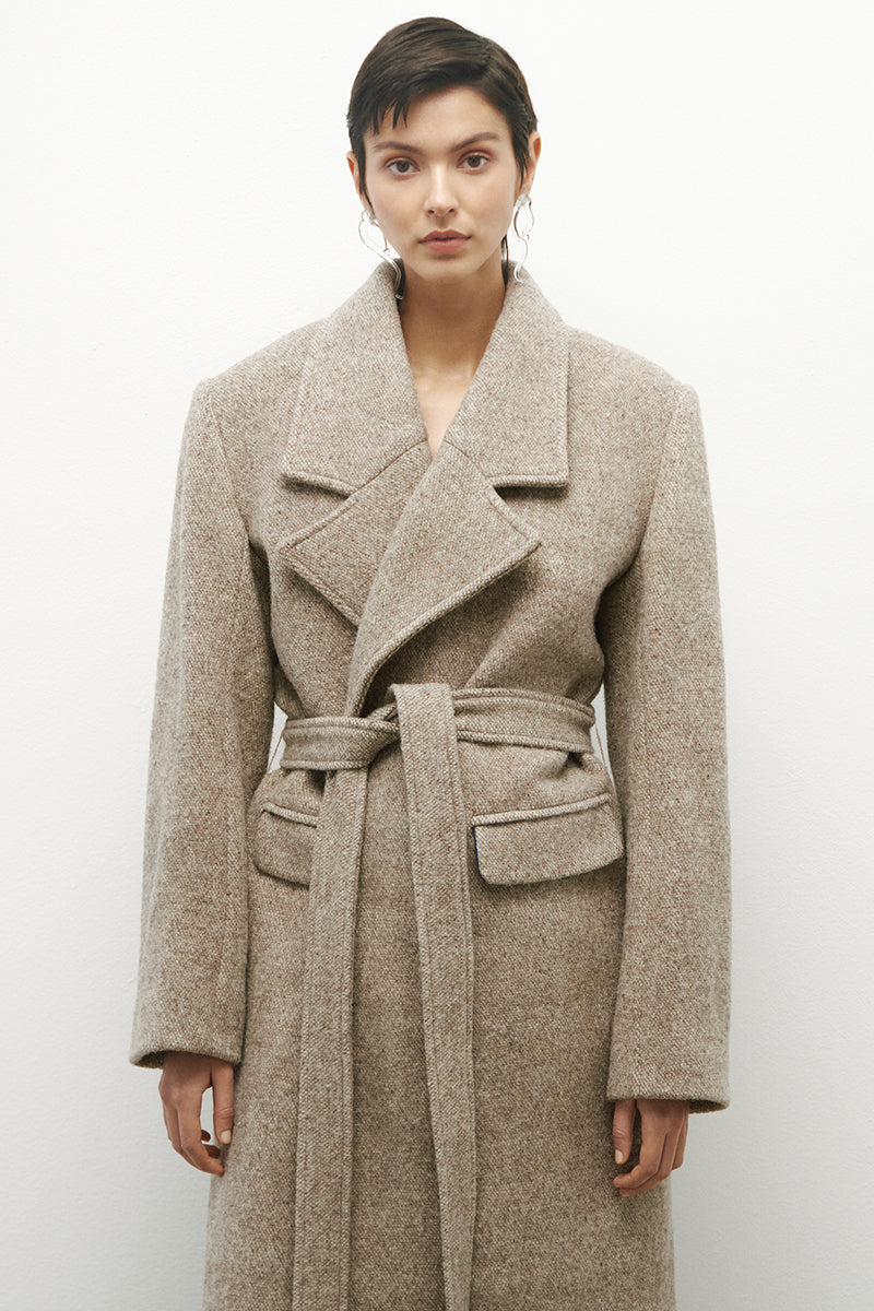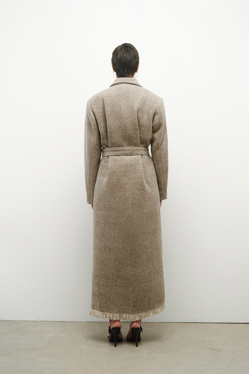 - Long coat made of virgin wool with pockets and handmade belt loops.