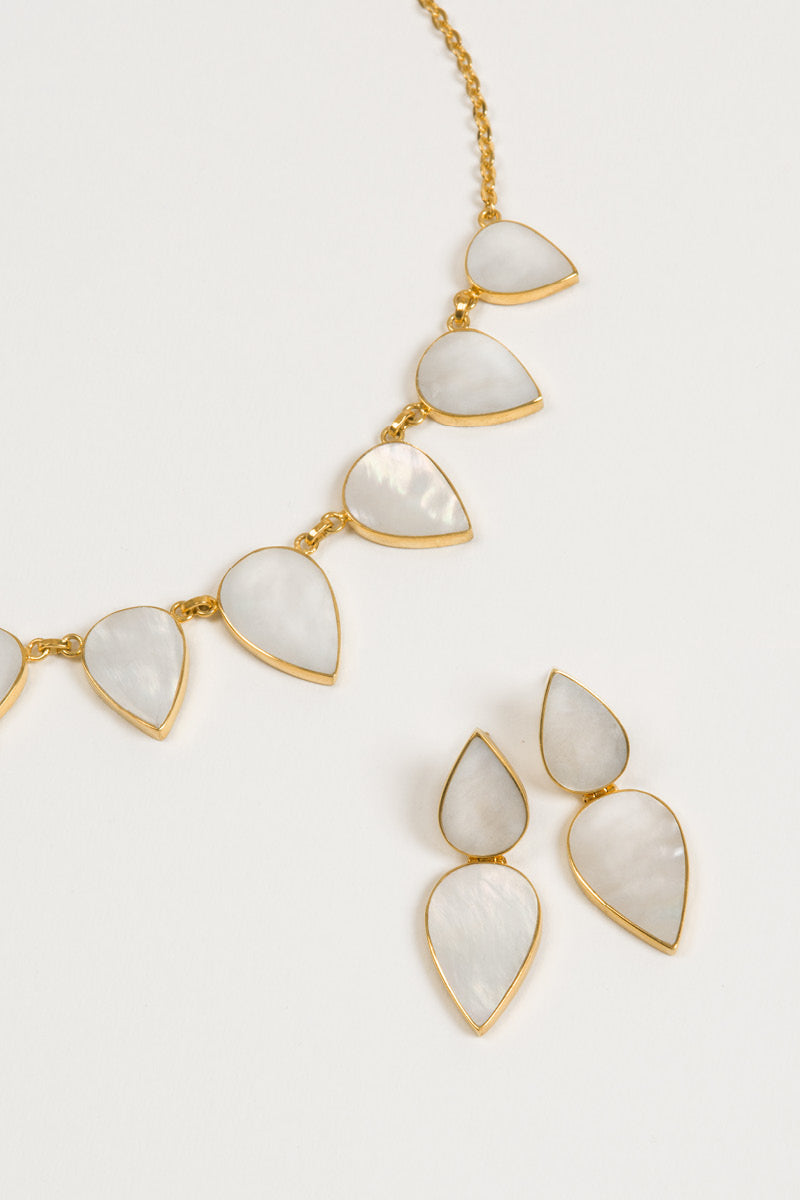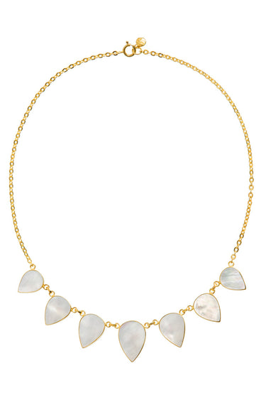 Handcrafted using ethically sourced Mother of Pearl with 7 Mother of pearl Pendants, and 18ct Gold Plated Sterling Silver Necklace.