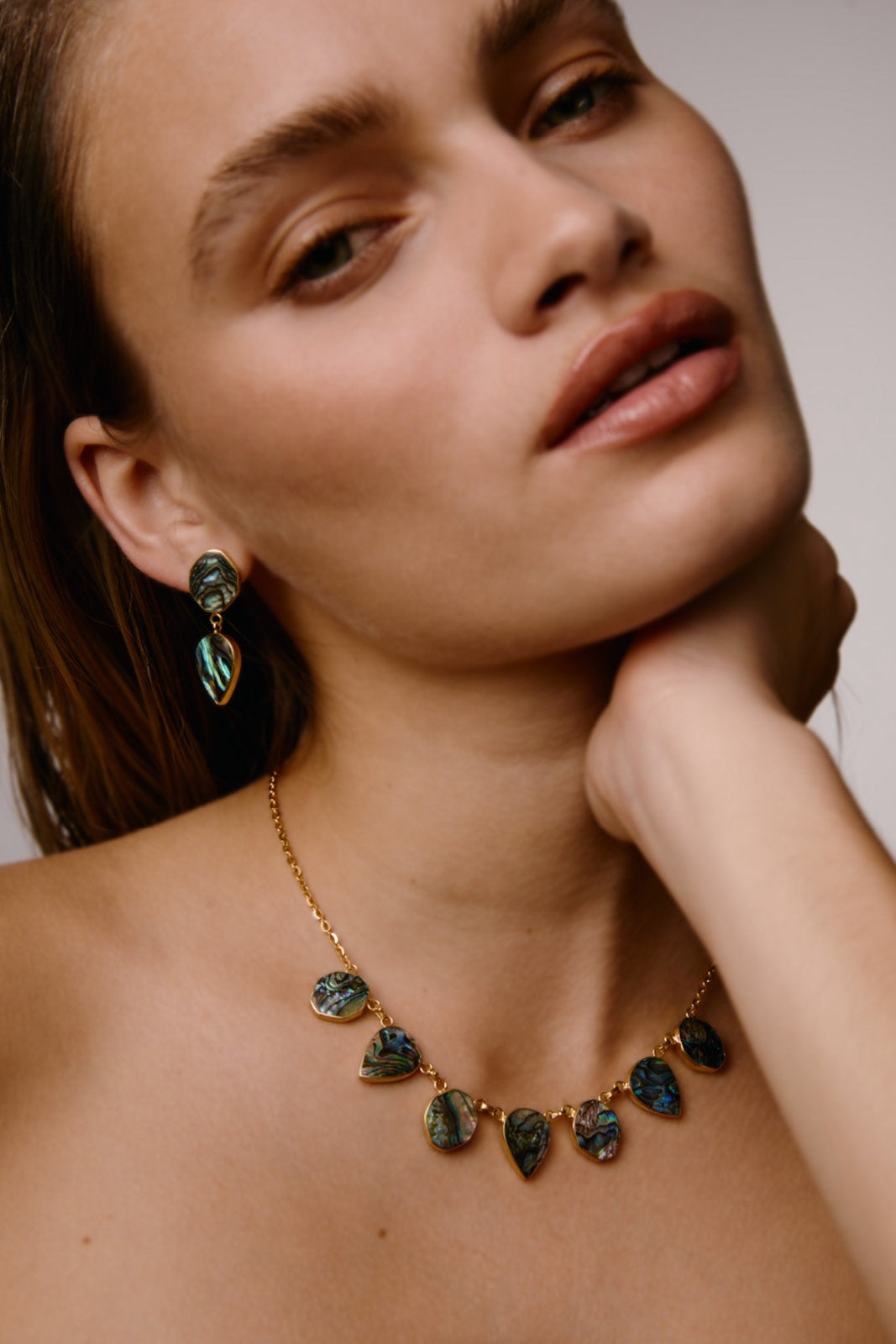 Handcrafted using genuine Paua/Abalone Shell and 18ct Gold Plated Sterling Silver and 18ct Gold Plated Sterling Silver Necklace with 7 Paua/Abalone Shell Pendants.