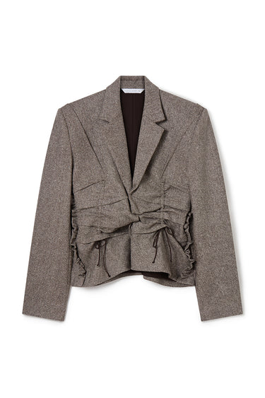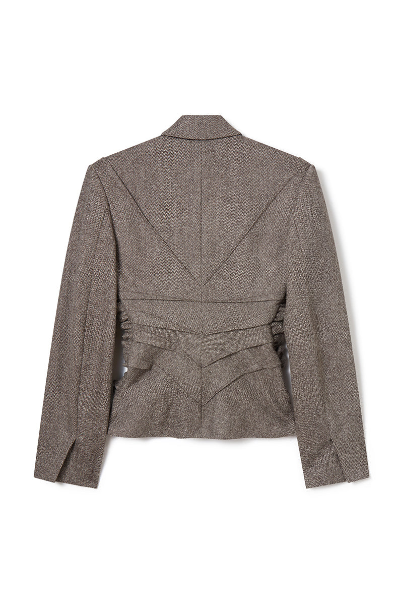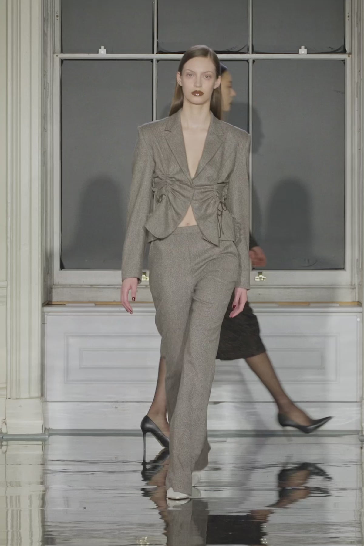 The LIZA is a mini flare tailored trouser in ivory-caramel textured tweed with a narrow waistband, slant pockets and side zip closure.