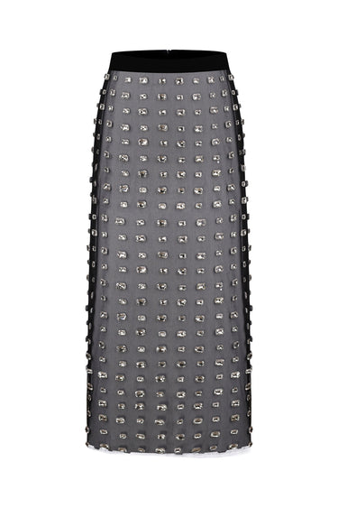A midi skirt crafted from semi-sheer mesh and adorned with large baquette crystals along its length. It has a straight silhouette and features a velvet waistband. The skirt is completed with a concealed zip fastening at the back and is fully lined with mesh.