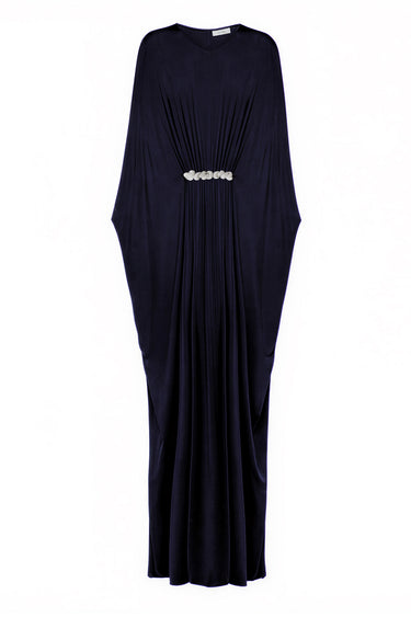 This draped kaftan dress is designed to move with you by sculpting the body in soft, fluid jersey. Thoughtfully gathered for a flattering silhouette, while the crystal embellished brooch detail at the front adds the perfect amount of sparkle.