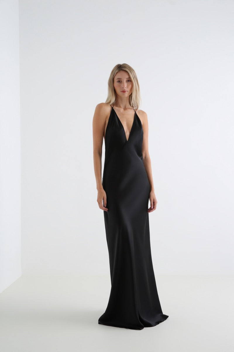 Cut from 100% silk satin, the Anima dress speaks in subtle textures and refined proportions. Its floor-grazing length, deep V-neckline and open-back create a fluid, elongating line, while the bias cut gently follows the body’s natural form. Thin criss-cross straps add a sense of ….
