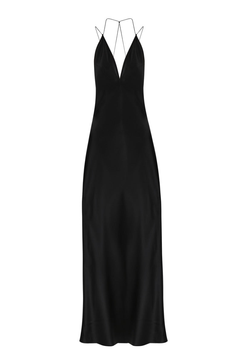 anima black deep v-neck silk-satin maxi dress