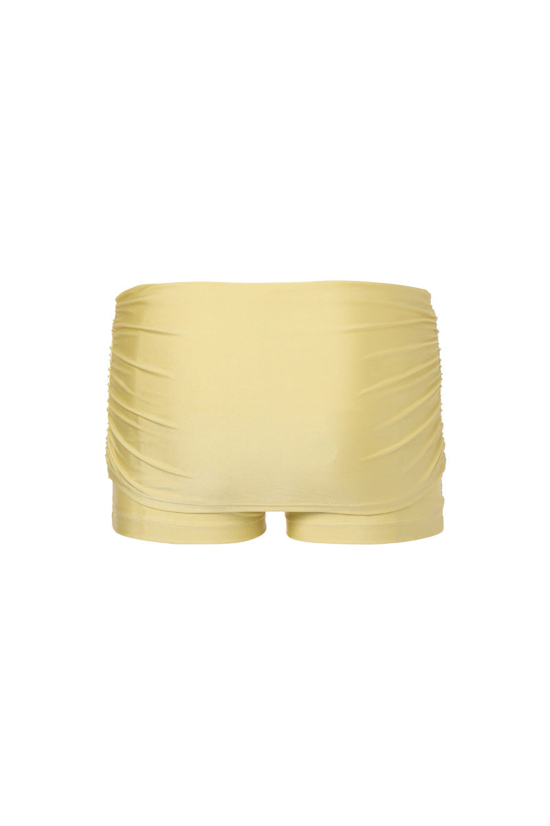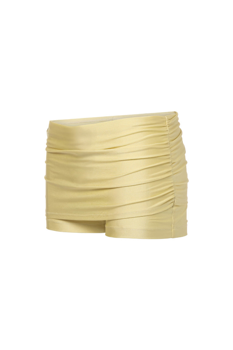 Dusty Butter Yellow Skort crafted from swimwear fabric, featuring a low-waisted fit with ruched sides. Designed with built-in shorts and a shorter skirt overlay.