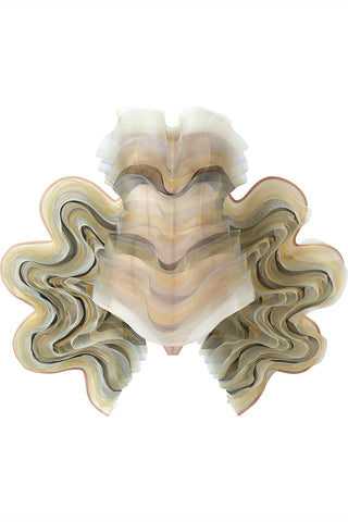 This dress features an artistic, structured design with sheer, flowing layers in neutral tones like beige, light brown, and gray. The bodice has an intricate wave-like effect, giving the outfit a fluid and sculptural look. The back of the dress has dramatic waves that extend outward, adding an element of dynamic movement.