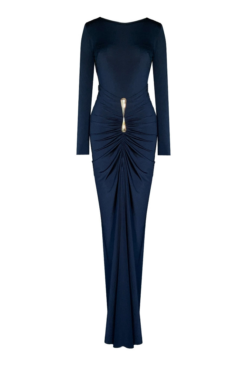 - Dramatic draping details at waist and hem