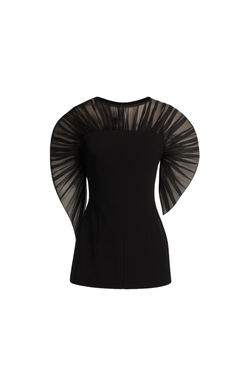 The top is a dramatic and sculptural black piece that fuses tailoring with couture-level artistry. It features a structured bodice with clean lines and a straight neckline, flaring subtly at the waist for a refined silhouette. The standout detail is the voluminous, fan-like sheer overlay in black organza that radiates outward from the neckline and extends down the sleeves. This sheer element is pleated and sculpted to create a wing-like shape that envelopes the upper body, transitioning from black at the top into soft pink on one sleeve and vivid red on the other, creating a striking color gradient. The result is a visually arresting top that blends structure, softness, and bold color blocking.