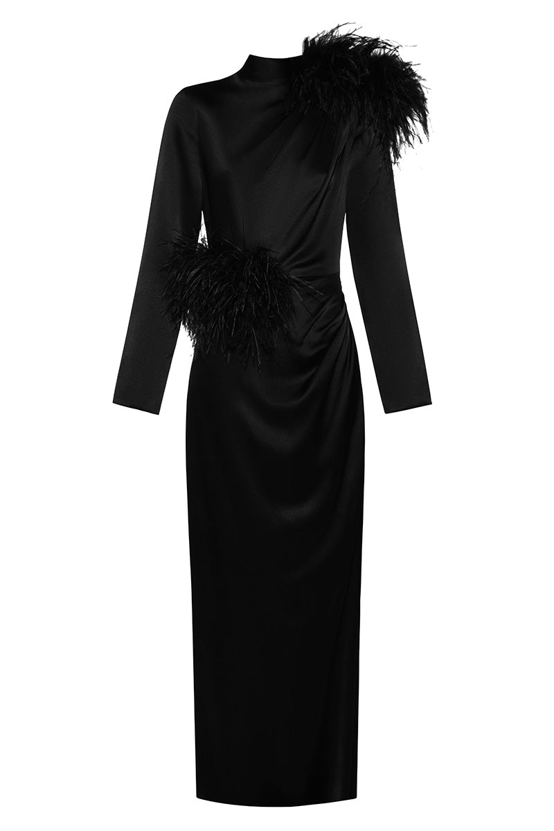 long sleeve high neck black dress with feather detials