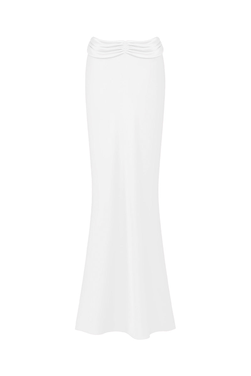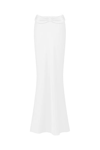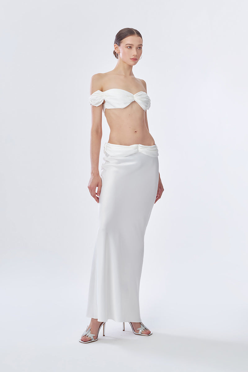 The luxurious PRINCESS MAXI SKIRT IN OFF WHITE features Stolen's iconic drape details on the waistline, a vintage-inspired design, and a back button closure. Its low waist style perfectly matches the Princess Bra. Handmade in Thailand with exquisite craftsmanship.