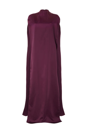 - Flowing long satin cape featuring elegant side slits on both sides, offering graceful movement and a dramatic silhouette