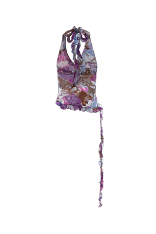 The Aura Top features a carefully curated abstract floral print, a halter neck and V-neckline, and hand-finished ruffles. Pair them with the Aura Skirt for a coordinated look from head to toe.