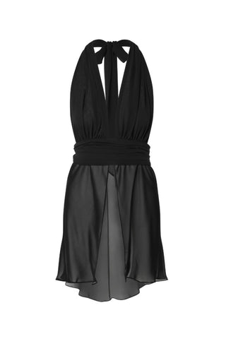 Black Halter Top features a halter neckline that ties at the neck and an open front with a deep cleavage. It includes a waistband with a back tie closure, while the lower part of the top is sheer with a delicate pico-finished edge.