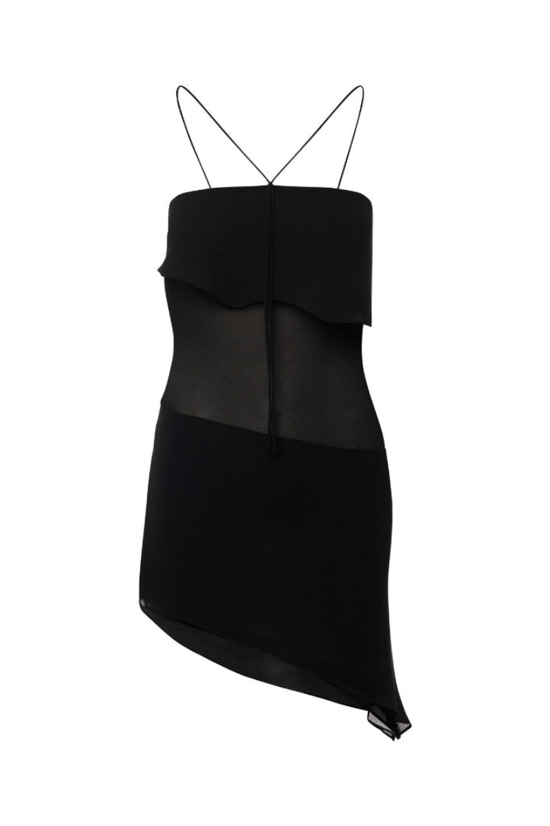 Black Mini Dress featuring a flat neckline with two straps extending from the center to the neck, tying at the back for an adjustable fit. It has an asymmetrical layered top, an open back, a gathered waist, and a subtly asymmetrical hemline.