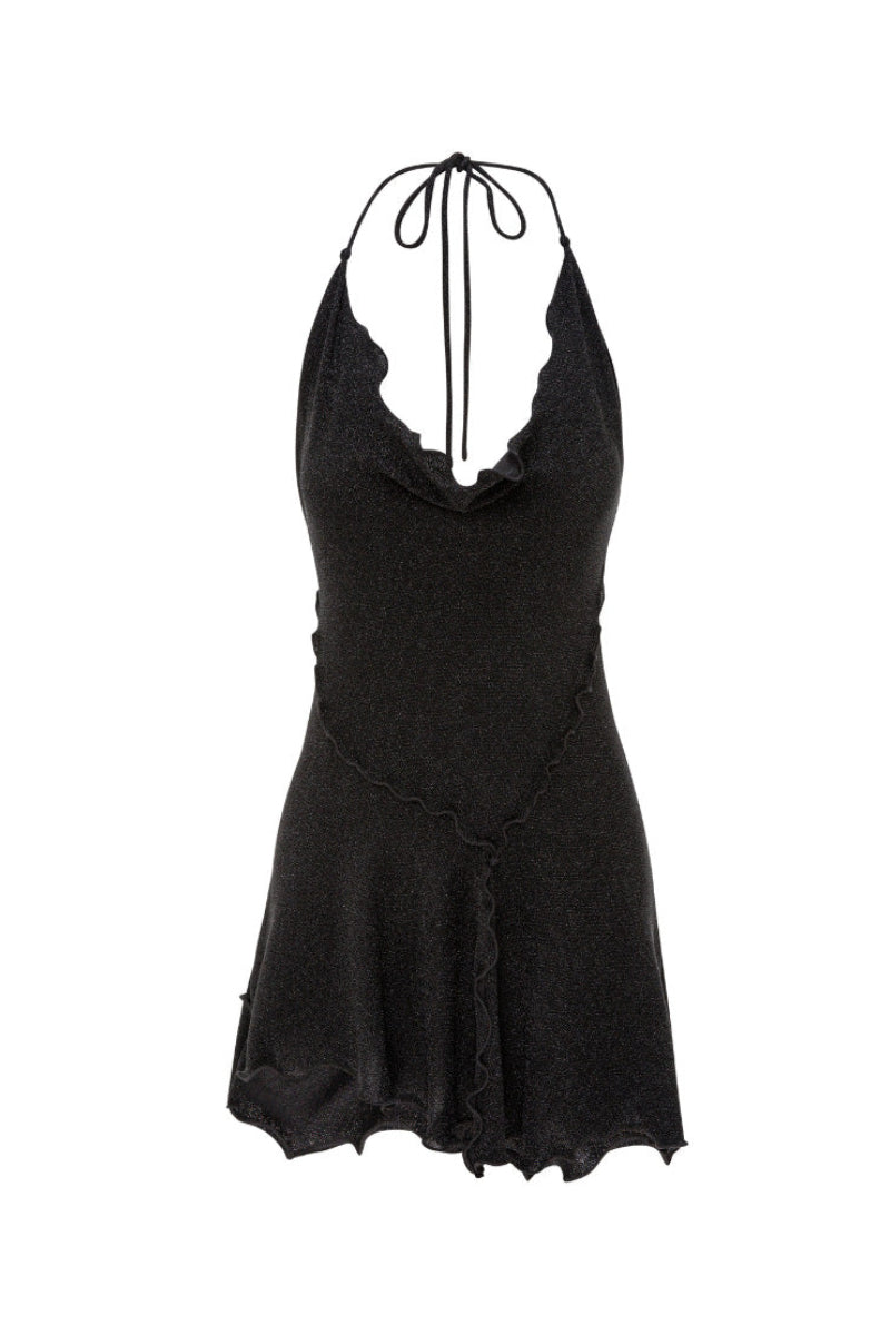 Black Mini Dress crafted from sparkly lurex fabric, featuring delicate pico-finished edges throughout. Designed with a halter neckline that ties at the neck and back, it showcases an open back and an asymmetrical skirt hem for a fluid, feminine silhouette.