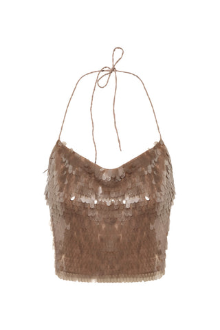 Brown Sequins Top is designed with a halter neckline and a daring open back, this top glimmers with delicate sequins. It features slim, adjustable straps at the back for a custom fit, combining a flattering silhouette.
