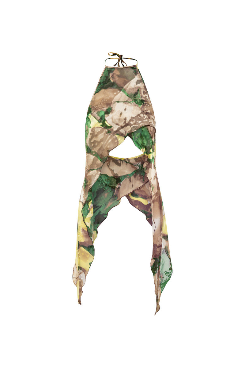 Floral Halter High-Neck Top featuring an open back and asymmetric side panels. Designed with a cropped silhouette that drapes longer at the sides. Finished with adjustable ties at the neckline.