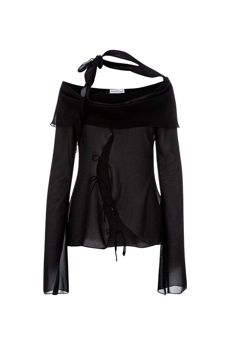 The Laura Top is made from sheer material, featuring long sleeves, a front tie closure, and a double neck that ties up at the back. For a coordinated look, pair it with the Laura Skirt.