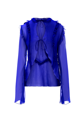 The Pina Top features long sheer sleeves with a front tie closure, hand-finished ruffles, and bell cuffs. For a coordinated look, pair it with the Pina Skirt.