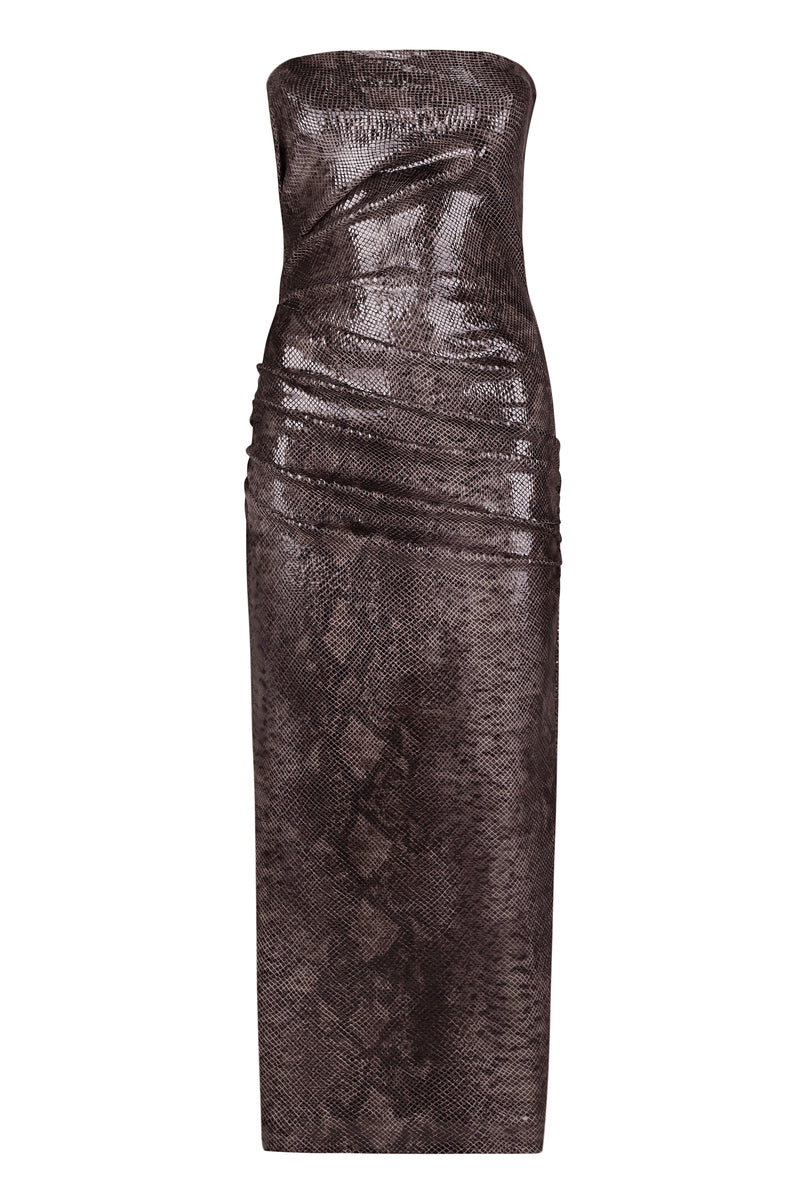 A midi dress elegantly draped all over is cut from a glossy stretch jersey with snake-effect faux leather. Its figure-skimming style has a strapless neckline and two-way zip closure at the back to adjust the slit.