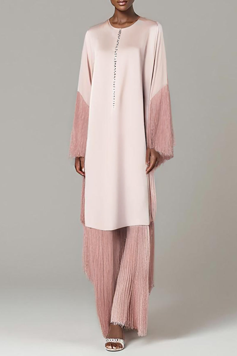 A dreamy fusion of movement and shine, this fluid kaftan enchants with soft fringe details and luminous crystal buttons. Designed for the woman who loves a whisper of drama, its fluid silhouette and delicate embellishments create an effortlessly sophisticated piece that exudes modern romance.