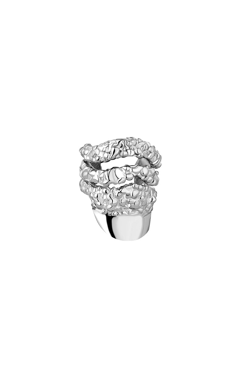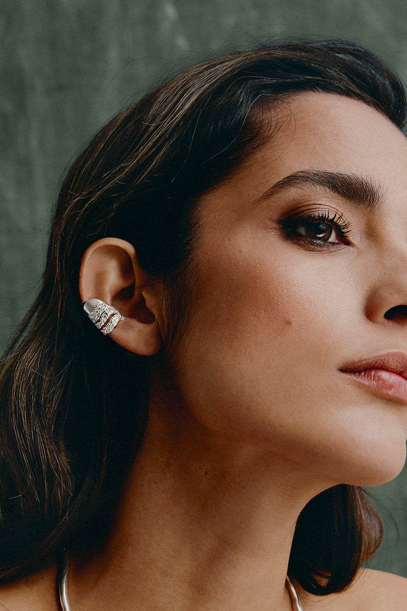 The Elea Ear Cuff features an eye-catching volcanic, granular texture that hugs the helix of the ear. Wavy cut-outs create the illusion of stacked layers. The final layer extends into a smooth and reflective curved design that complements the rough texture – a reflection of the multi-dimensional experience of love.