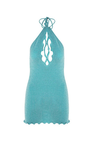 The Paola Dress comes with a top featuring halter neck self-ties turning into a completely open-back design that hugs your silhouette. The Bottom part of the dress follows a ruched design. It details a delicate, hand-finished hemline with a gently frayed edge. This dress is cut from high-quality sparkly lurex fabric making it perfect if you're dressing up for a night out or getting ready for a beach day.