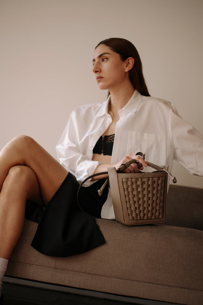 La Dorada mini is a timeless piece, inspired by the art-deco architecture and the free spirit from the seventies. This piece converge traditional leather work and the artisanal techniques from Colombia Features two hand weaved lateral panels in leather, our versatile and spacious mini tote converges the craft and dedication in the leather work