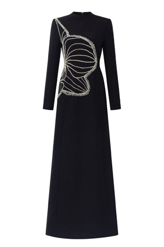 Elevate your presence with our enchanting dress, where the high neckline imparts a regal touch and the long sleeves exude a sense of grace and modesty. Impeccably designed for a seamless fusion of style and comfort, this dress is a captivating symphony of sophistication and ease. Adorned with intricate crystal embellishments, it becomes a masterpiece that effortlessly transcends formal affairs and chic gatherings. Let this dress be your crowning glory, a beacon of poise and modern allure, showcasing the perfect equilibrium of glamour and refinement.