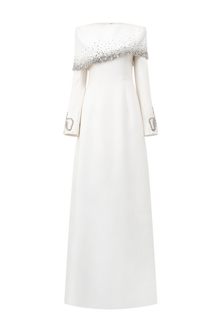 - Crystal-embellished at the shoulder cape and sleeve cuff