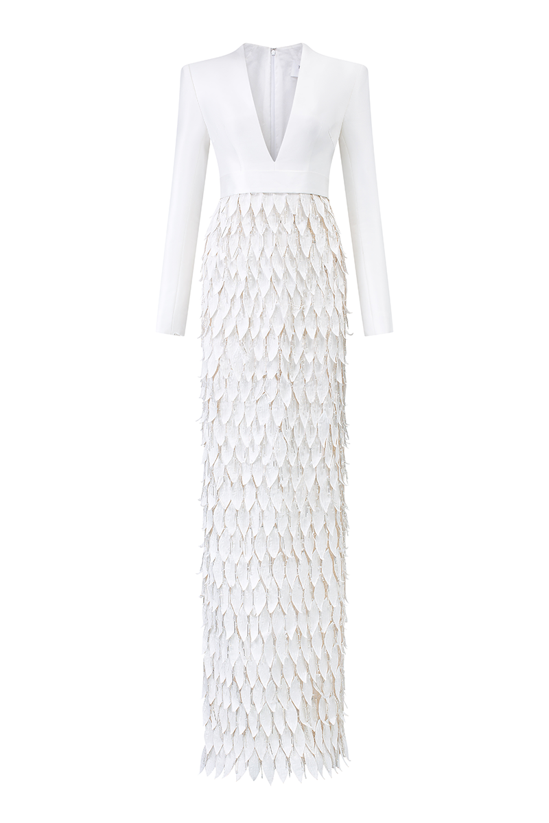 In a world where elegance intertwines with universe's splendor, behold this masterpiece of grace and allure. This dress is not just attire; it's an ode to artistry and the beauty of the cosmos. With a deep V-neckline and long sleeves exuding timeless sophistication, every detail is meticulously crafted to captivate. The spotlight, however, belongs to the intricate layers of leaf embellishments adorning this garment. Each leaf, painstakingly placed and adorned, tells a story of dedication, crafted over countless hours by the hands of an artist. Complemented by bold buttoned cuffs on the sleeves, this dress with a pencil skirt form, promising to grace your figure with elegance and poise.