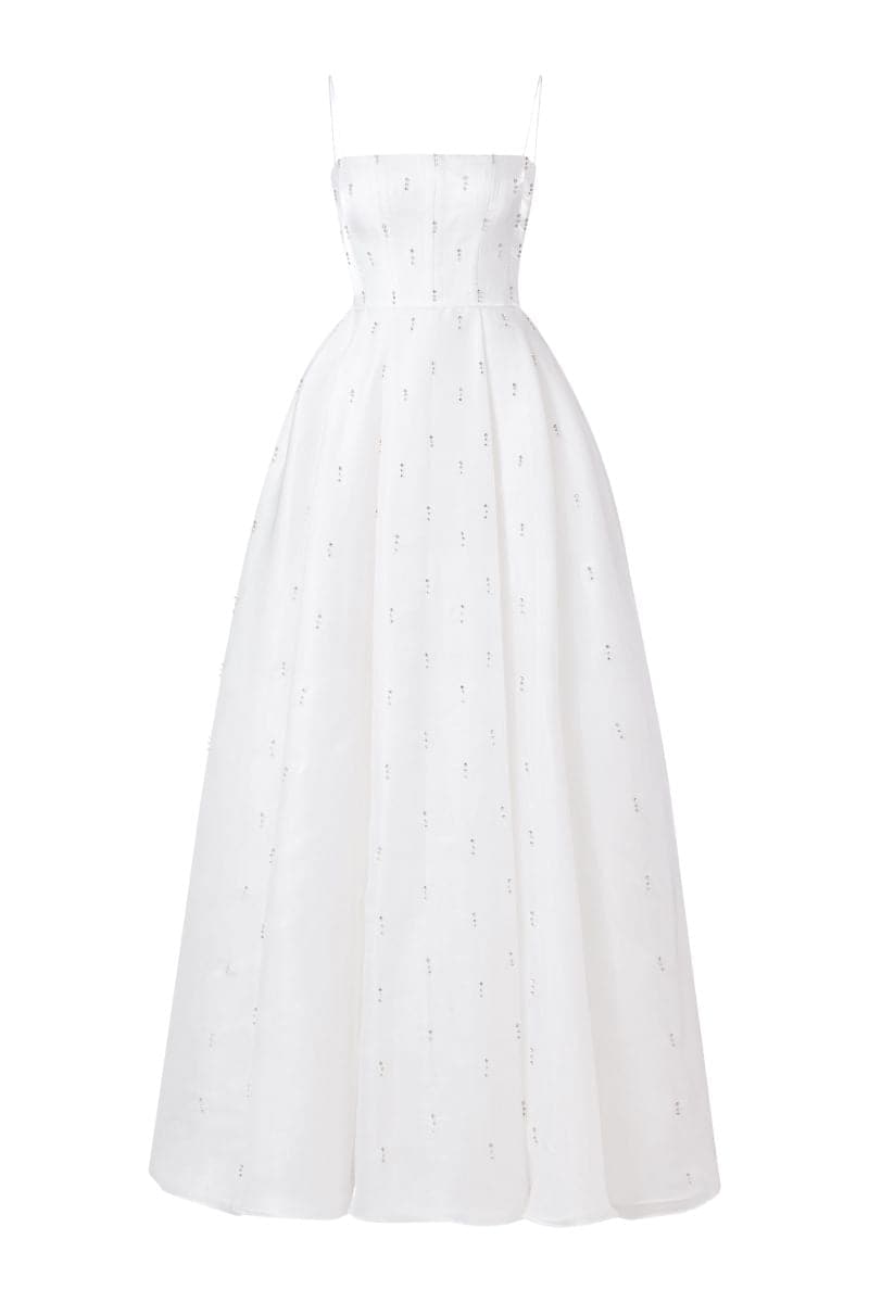 white strapless stone embellished full dress