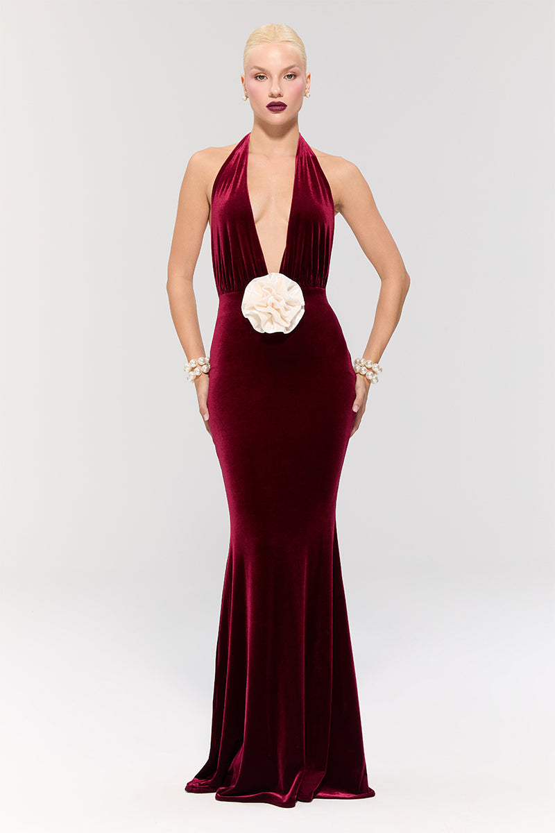 - The dress features a deep V-neck and back cutout, with a large waist flower adding a feminine touch