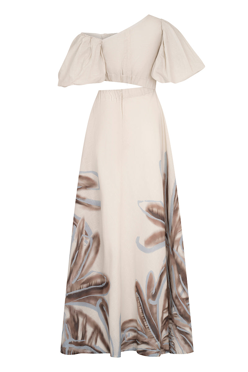 This one-shoulder maxi dress is defined by its sculptural silhouette and fluid drape. Designed with a voluminous puff sleeve and a cut-out detail at the waist, it falls into a floor-length skirt finished with an oversized botanical illustration, developed in our in-house atelier.
