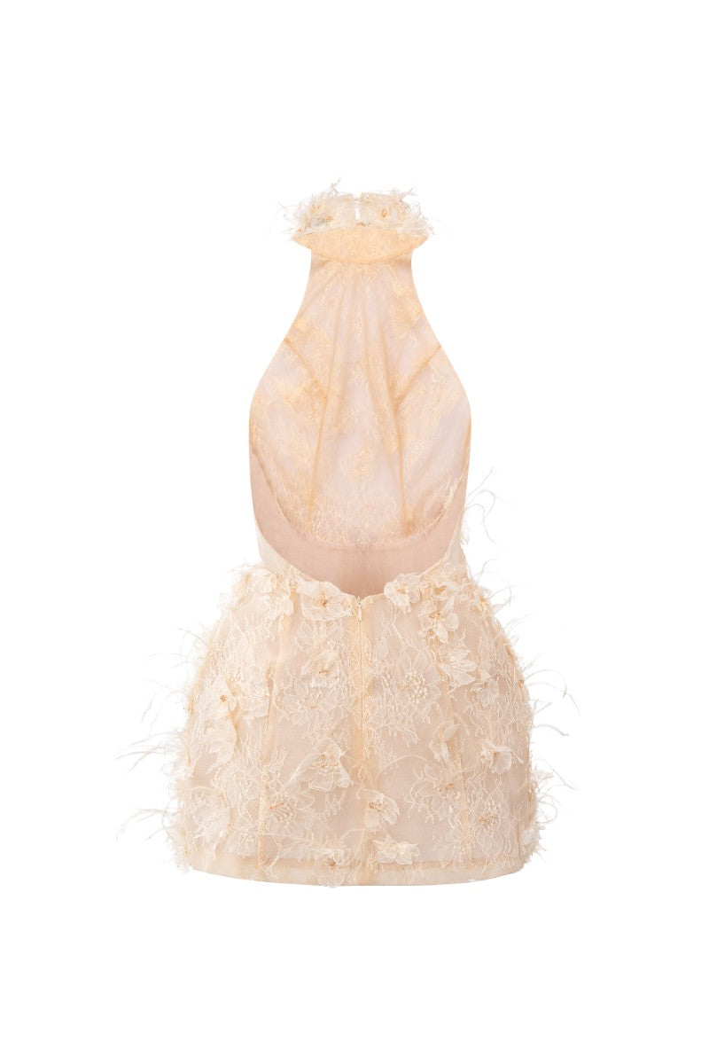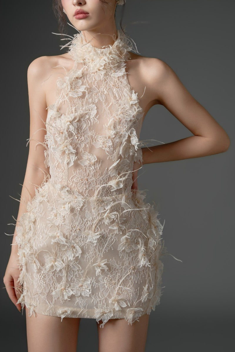 - Handcrafted 3D floral appliqués, crystal embellishments & soft feathers