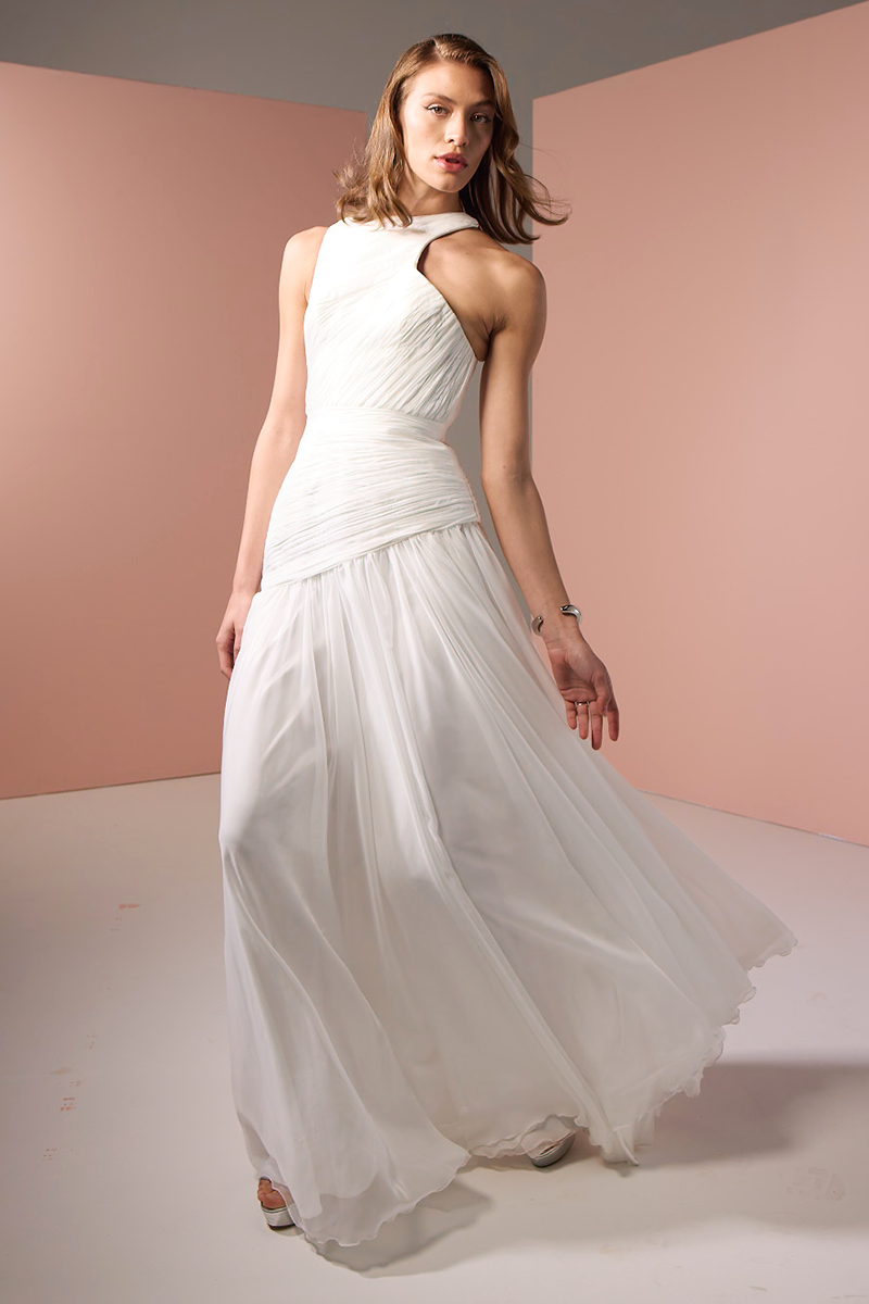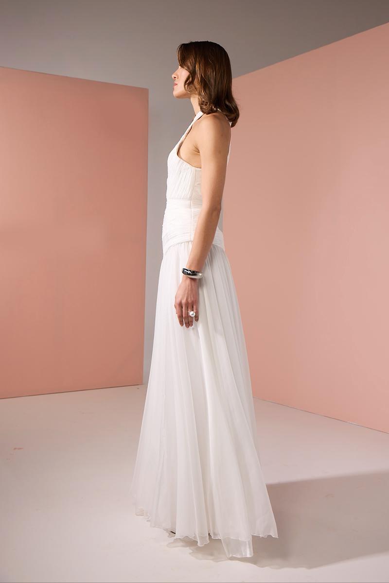 - Fully hand- draped for a fluid, sculptural silhouette