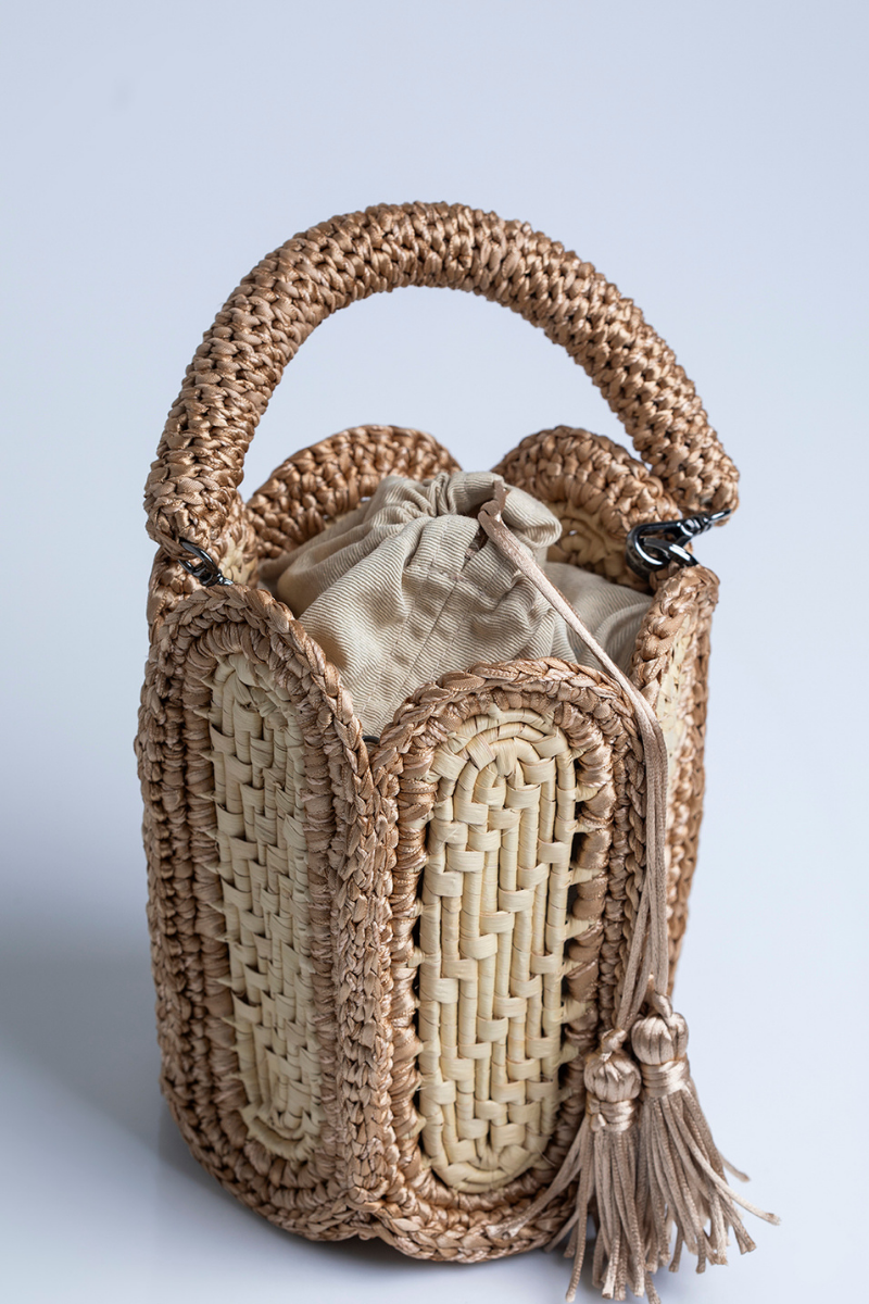 Composition: Crochet: 20% Cotton yarn + 10% Satin cord + 10% Polyester cord and 60%Straw