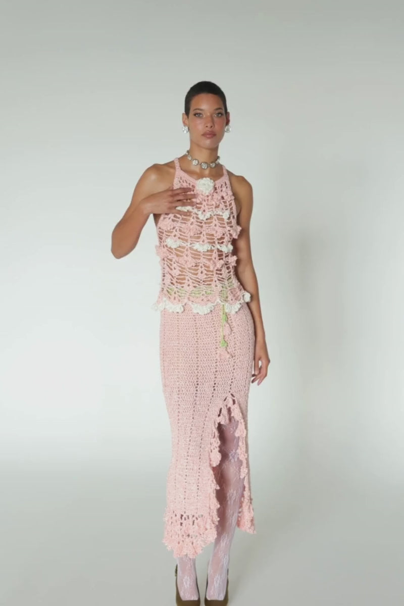 Pink handmade crochet top made by hand, these crocheted top features a loose open-knit detail throughout, a fitted silhouette great perfect look. Decorated with hand crochet flowers. Match it with white crochet skirt or shorts.