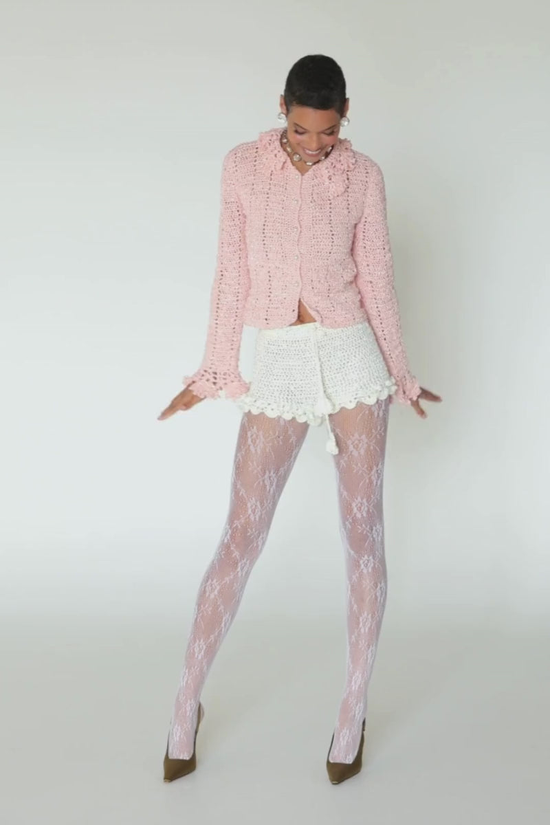 Chrysanthemum White Handmade Crochet shorts made of viscose & cotton yarn. These light handmade knit shorts definitely makes you unique during summer and spring time. Shorts looks perfect from casual style to evening dresses.