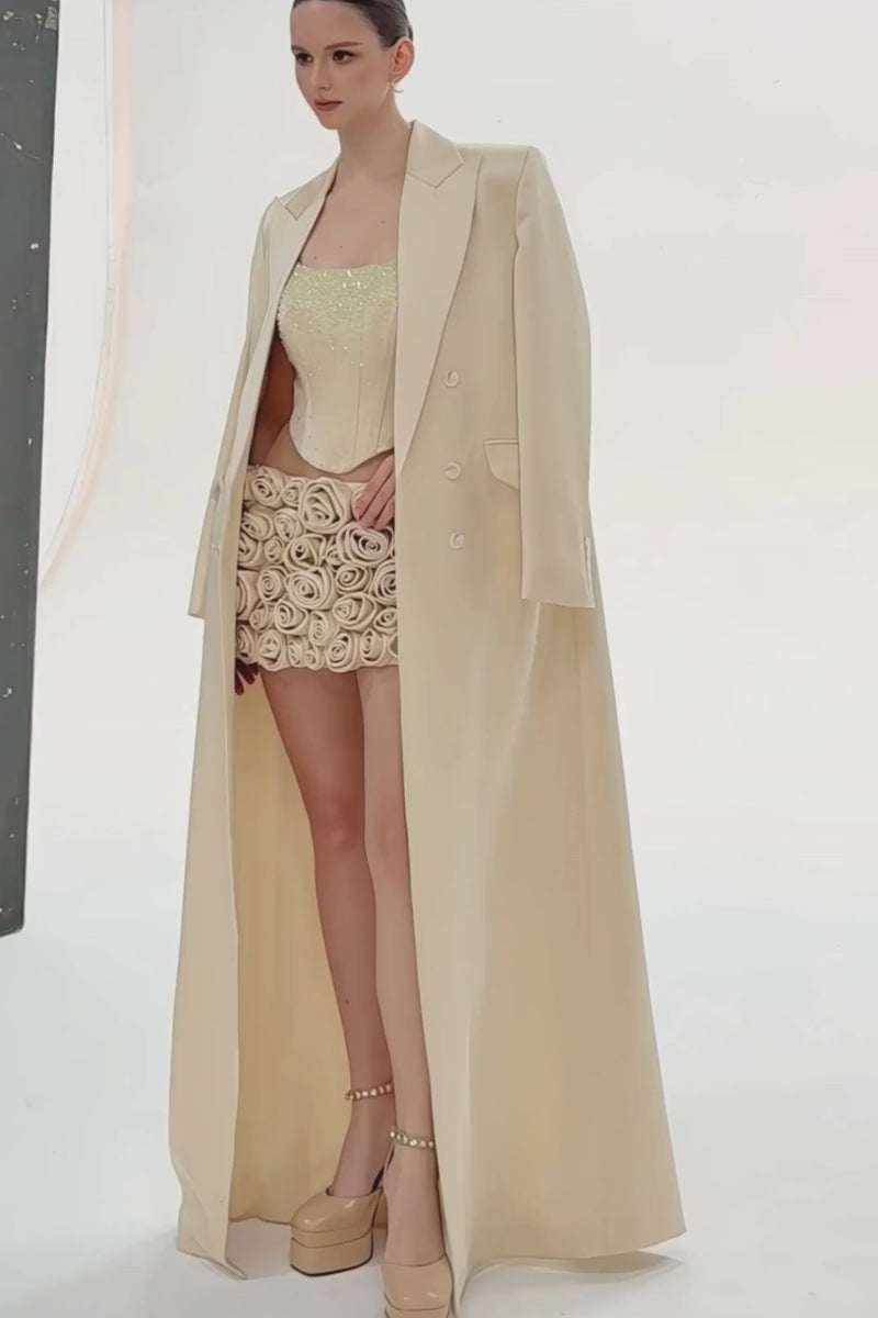 A shimmering corset top paired with an intricately embroidered mini skirt, blending modern glamour with delicate craftsmanship for a bold yet refined look